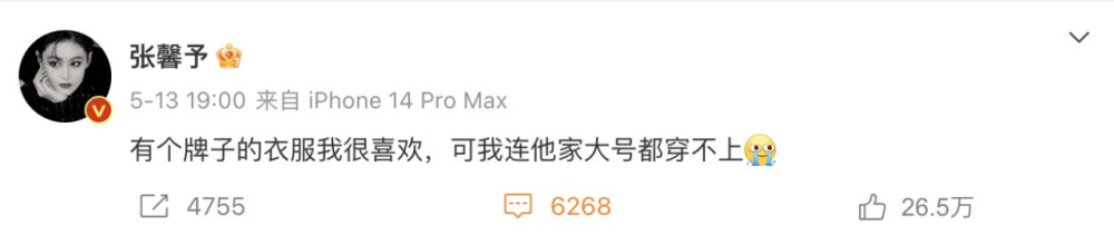 5月13日,一名女演员发微博称自己喜欢某品牌的衣服,却穿不下它家的大号,并在评论区无奈表示“真的觉得对身材有点苛刻了,100斤以上没资格穿”。