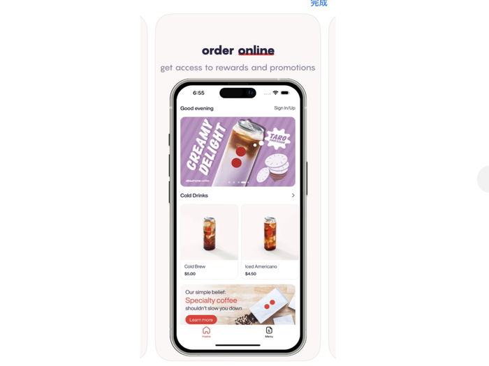 About Time Coffee最独到的地方是便宜。平均价格在4美元以下,比星巴克的平均售价要便宜1美元,首次下载App,注册还能免费送五杯。
