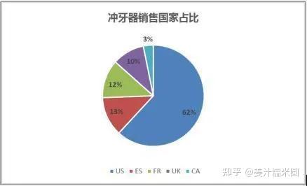 有图看出,北美是口腔冲洗器的最大市场之一。牙齿疾病的患病率上升和牙齿保健意识计划的出现,正在为该地区的口腔冲洗器市场的销售商增加商机。DH平台冲牙器热销的国家主要为美国、西班牙、法国、英国和加拿大,其中美国占比为62%,为主要目标市场。