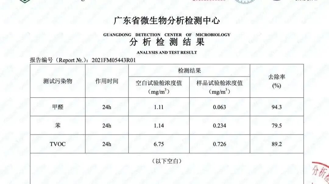 经过国家广东省微生物分析检测中心检测认证,【广药白云山除甲醛魔盒】对甲醛,氨,tvoc等有害的气体有着不俗的清除效果!