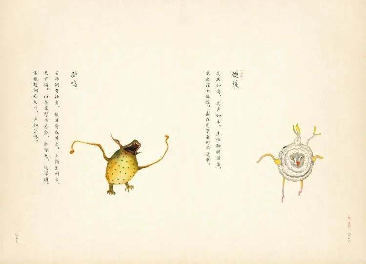 比如“驴鸣”,它的头两侧有触须,眼睛、耳朵都长在触须上,张大嘴巴,腹部浑圆,所以我设定它“常振翅朝天大叫,声如驴鸣”;“啮山”的牙齿就像一把钳子,可以咬合,所以它常常啃啮着一块山石,在天上飞;“剔梳”有一个很长的喙,常用喙梳理羽毛,所以它有洁癖,经常在阳光之下专心致志地剔毛梳羽,也很少鸣叫。