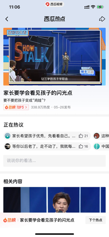 除此之外,西瓜视频《健谈大会》第二季整合传播资源,在西瓜视频和抖音打造了多个原生热点议题,如拒绝育儿焦虑不做满分家长、全职爸爸带娃压力有多大等;而在站外12位节目嘉宾更是在微博、小红书等渠道自发传播。