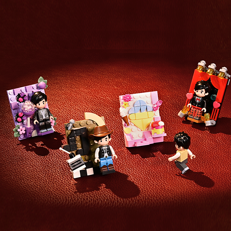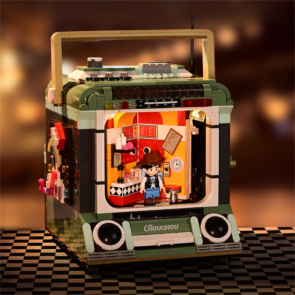 周同学正版授权积木第二弹——Keep Running周同学,开发灵感同样来源于周同学的音乐世界,这次我们主打一个复古基调,选用经典怀旧的磁带机作为载体,延续全印刷件0贴纸的传统,并采用摇杆联动轴转机关,重现了牛仔酒吧、青花拍卖行、阳光小屋、秘密琴房四个周同学音乐场景。