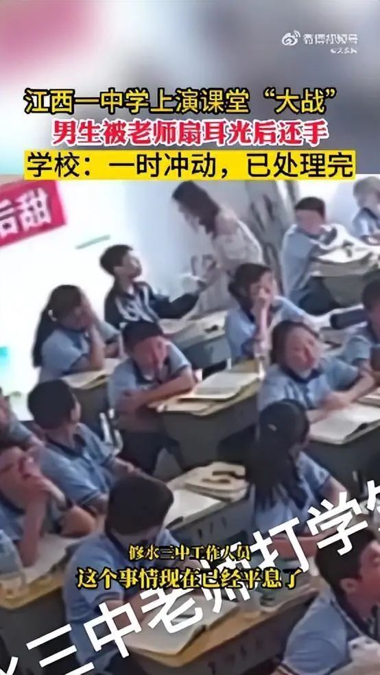 据澎湃新闻,6月14日上午,修水县教育体育局办公室一名工作人员告诉记者,事发于修水县第三中学的初一课堂上,涉事老师任班主任,上课时,涉事学生做了一些“和学习无关的事”,老师上前制止,但学生不服管教,老师比较生气,动手打了学生,遭到学生还手。