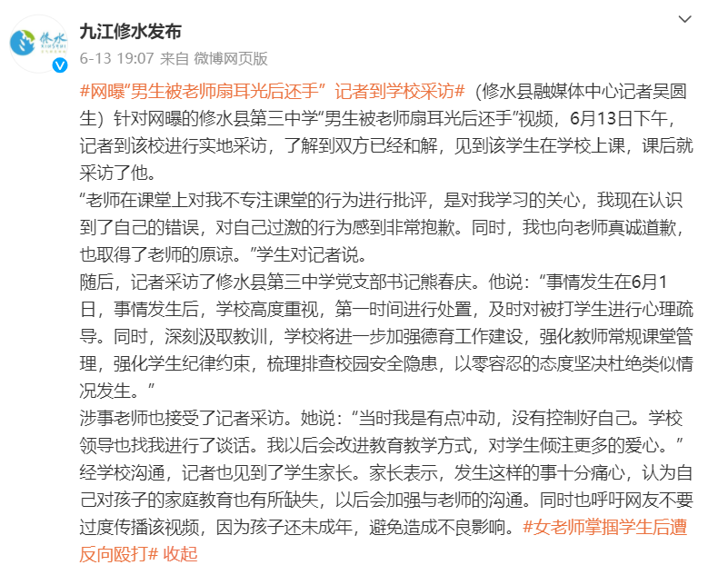 据潇湘晨报,6月14日,修水县教育体育局办公室的一名工作人员告诉记者,事情发生后,已经对涉事老师进行了严肃的批评教育,诫勉谈话,停止了她的班主任工作。涉事学生也认识到自己在课堂上违反纪律这一行为是不对的,主动向老师和学校认错。