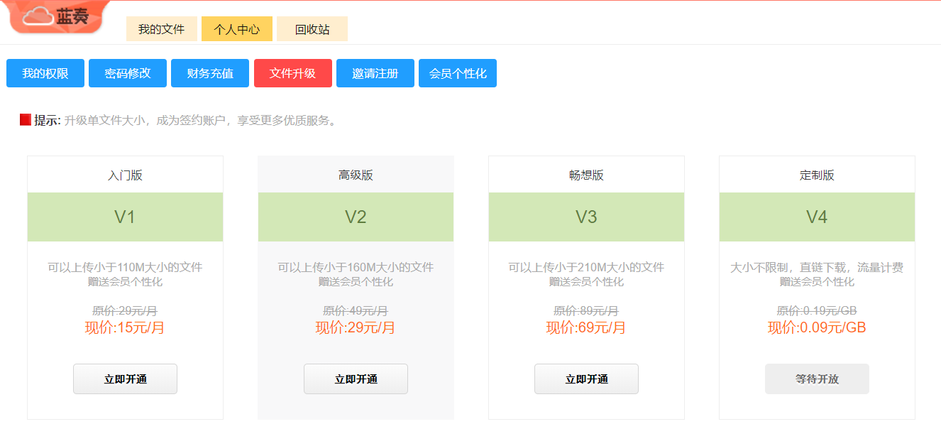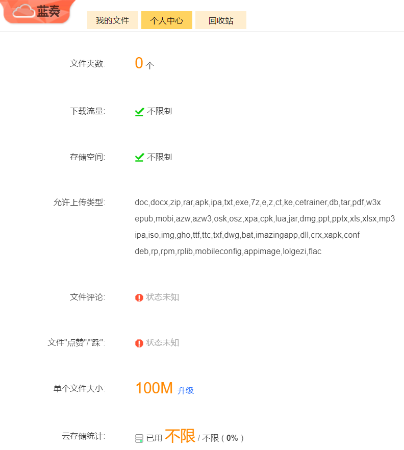 蓝奏云。蓝奏云最大的优势就是完全不限制空间大小,但缺点也很致命,单文件大小限制100M以下,即便是付费,也差不了多少。速度很不错测试链接:https://ww.lanzous.com/b015coxri