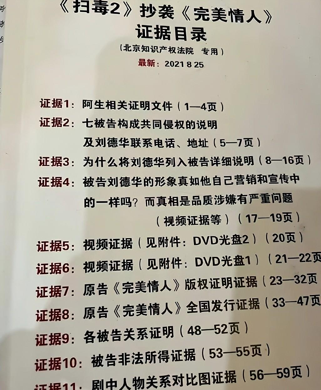 导演阿生称,刘德华的《扫毒2》抄袭了他2006年所拍摄的电影《完美情人》,为了证明自己所说的是真的,还在网络上晒出了很多证据,对两部电影进行了人物关系、镜头等方面进行对比。