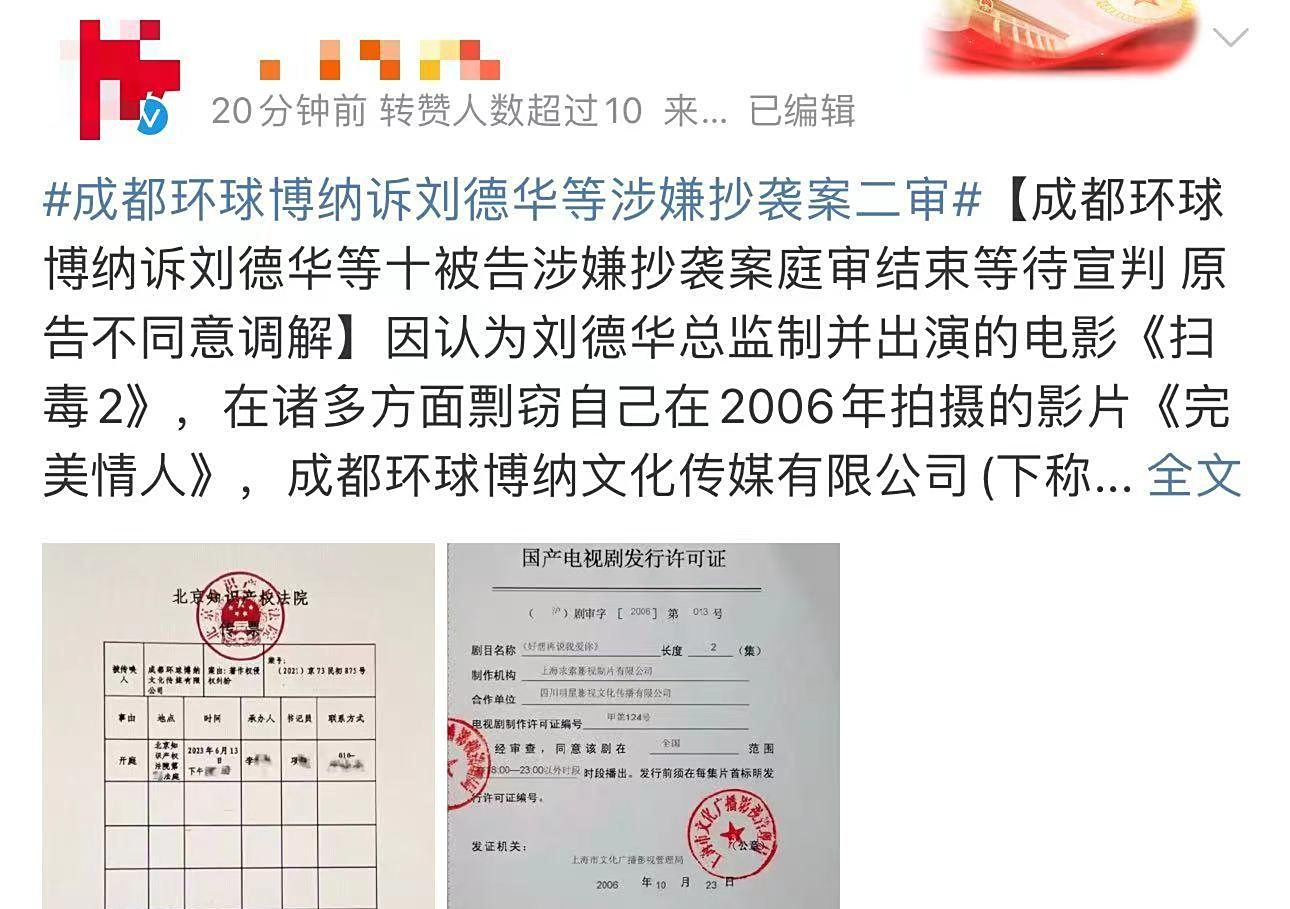 6月17日,成都环球博纳起诉刘德华作品涉嫌抄袭的二审结束,博纳并不同意和解,还向刘德华索赔9999.9999万元人民币。