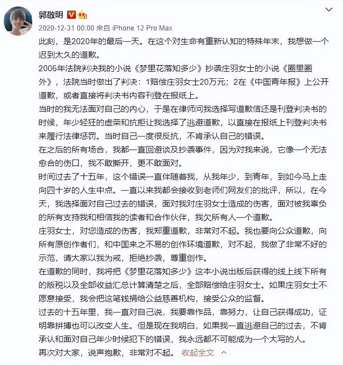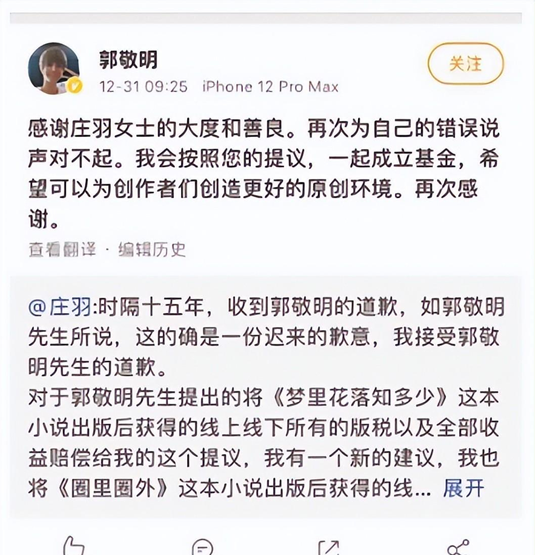 这操作给了他们不少的压力,郭敬明率先出来进行道歉,说自己做了不好的示范,对庄羽表示抱歉,并且将《梦里花落知多少》的全部收益给她。