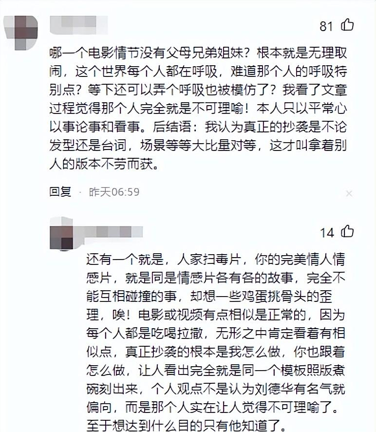 还有网友对这种做法很不懂,觉得这阿生就是在无理取闹,两部剧一个是扫毒片,一个是情感片,是两个不同的故事,认为阿生是在鸡蛋里挑骨头等等。