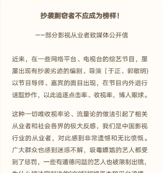 2020年,有111名编剧、导演联合出来抵制郭敬明和于正,原因是他们涉嫌抄袭,号召不要给抄袭者提供舞台。