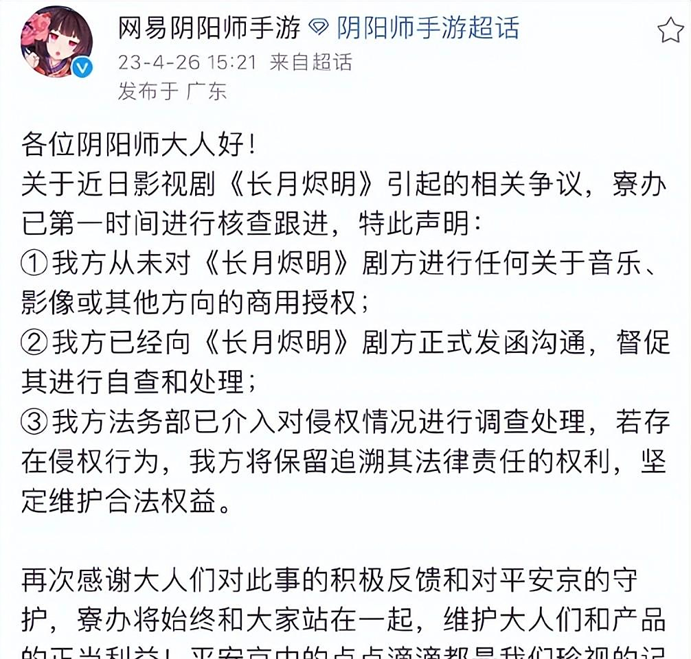 后来,阴阳师官方也发出了声明,确认自己并没有授权给任何电视剧,并且对《长月烬明》剧组发函沟通,坚持维护自己的利益。