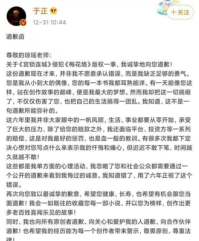 郭敬明道歉后,于正也迫于压力,站出来向琼瑶道歉。