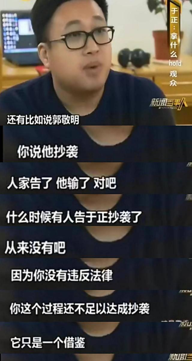 在一次采访中,于正就郭敬明抄袭事件发表了自己的观点,其中就说到,郭敬明抄袭了,所以他输了,却从来没有人告于正抄袭,因为没有违反法律,也不足以达成抄袭。