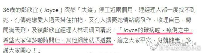 她称:“Joyce(郑欣宜)的确病了,疗伤之中,其他细节就不透露,总之大家平安,身体健康,多谢大家关心!”