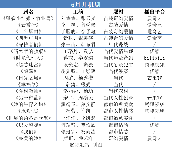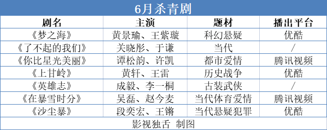 6月杀青剧类型各异,还包括武侠剧《英雄志》、悬疑剧《沙尘暴》、爱情剧《你比星光美丽》等。这些已经进入后期制作的剧集,距离和观众见面的日子,不会太远了。