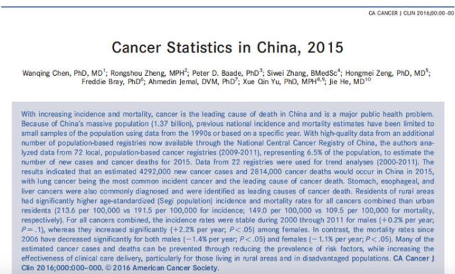 [6].Wanqing Chen,Cancer Statistics in China, 2015,National Cancer Center,CA CANCER J CLIN,2016;