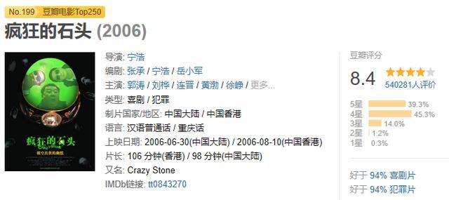 《疯狂的石头》是一部小人物的喜剧,成本很低。当年一上映就获得了观众的喜爱。它的土味和幽默迄今为止都是观众深深怀念的东西。影片中的几位男主演没有颜值,但凭借演技成功出圈。