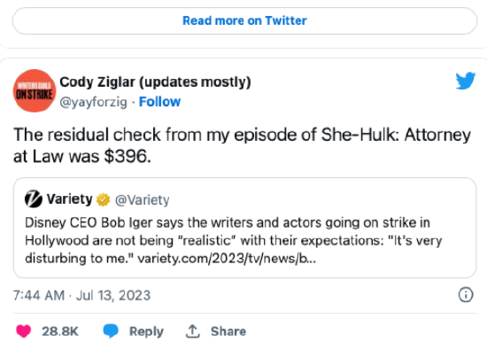 编剧是好莱坞影视作品的基石,但却是好莱坞最缺乏保障的一环。由于收入太低,很多编剧发现他们已经无法在洛杉矶、纽约这样的娱乐中心生活下去。在编剧们大罢工之后,艾米奖得主、知名编剧艾什莉·妮可·布莱克(Ashley Nicole Black)在推特上写道,“罢工很可怕,但我们面临的未来更加可怕,低薪,没有工作保障的自由职业者。”