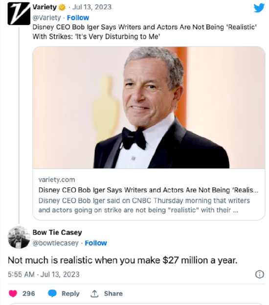 就在上周,迪士尼董事会决定延长艾格尔的临时CEO期限,让他继续管理这家娱乐巨头直到2026年,同时将艾格尔的年薪从2700万美元上调到3100万美元。在加薪续约的新闻背景下,亿万富翁艾格尔的这番表态更引发了演员工会和编剧协会的愤怒,成为了口诛笔伐的对象。