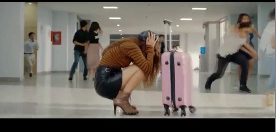 当时,女主角刚下飞机,结果走着走着,楼里突然发生了爆炸,吓得她原地石化,捂着耳朵一动也不敢动。