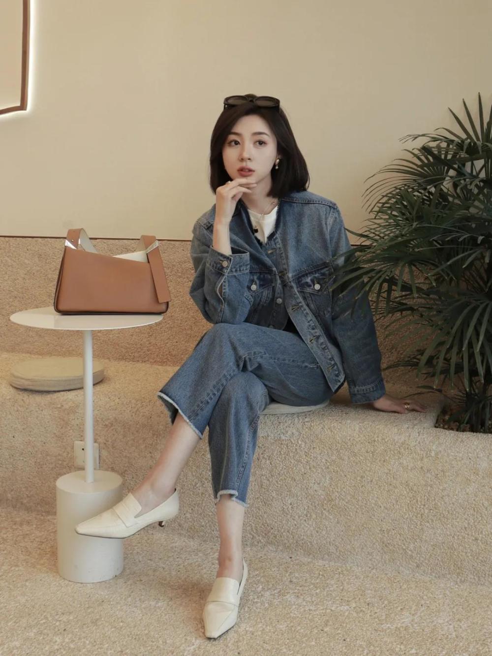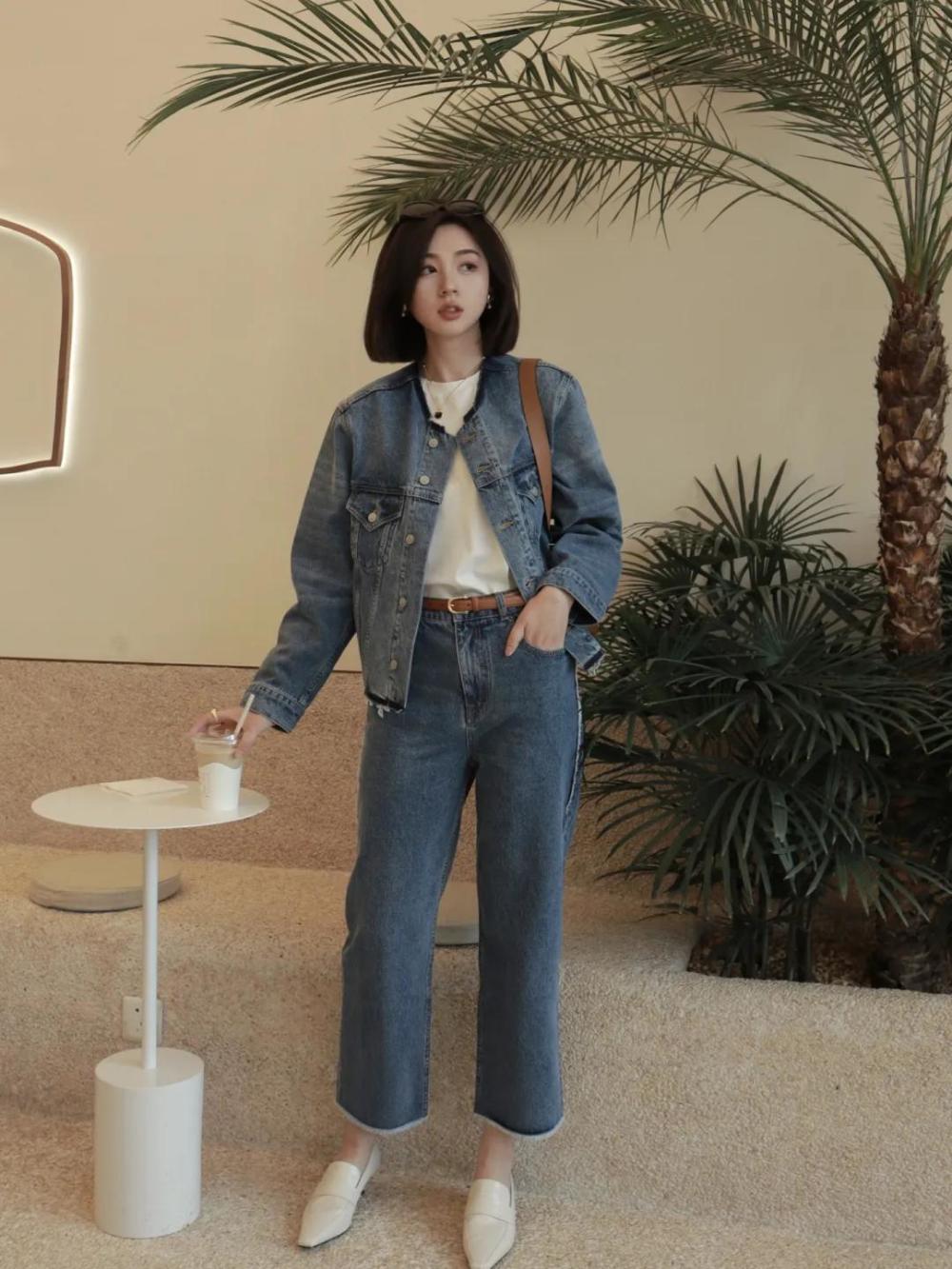 像第一套用的就是同色系列的牛仔外套,因为牛仔面料的衣服单品天生就拥有时尚元素,正好和牛仔裤组合在一块,就能打造出知性利落的穿搭风格。