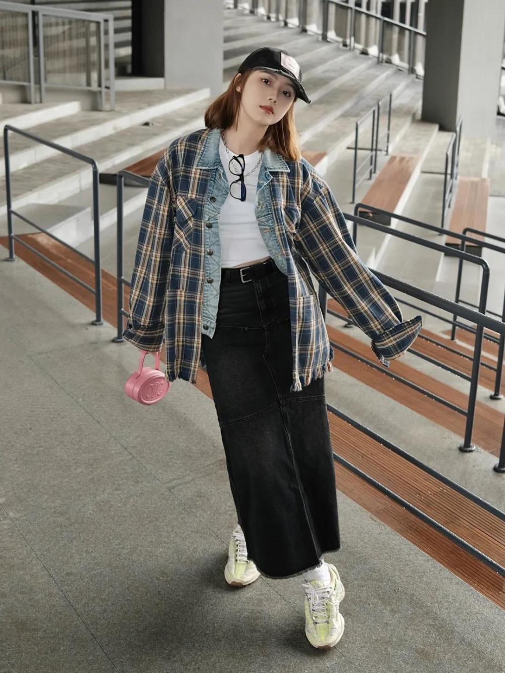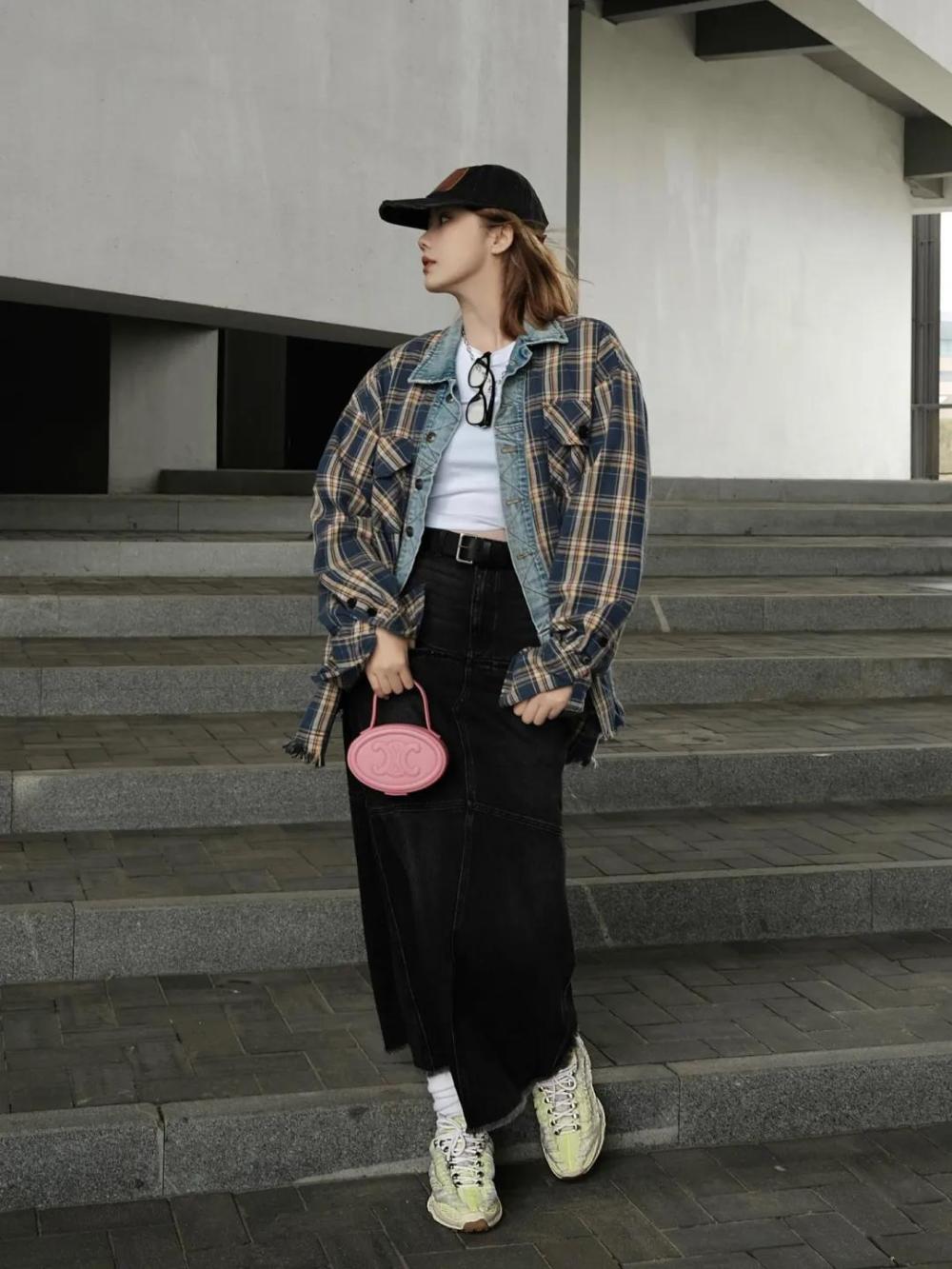 像博主一样,用格纹的衬衫内搭白色的打底衫,下半身是一条黑色的牛仔半身裙,搭配起来视觉冲击性非常强,稳赚回头率,同时,让整个造型显得不会那么地单调。
