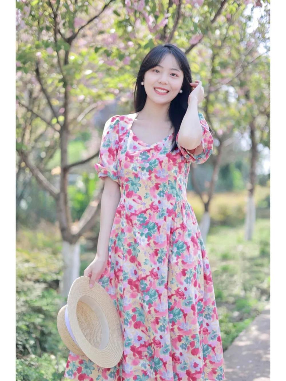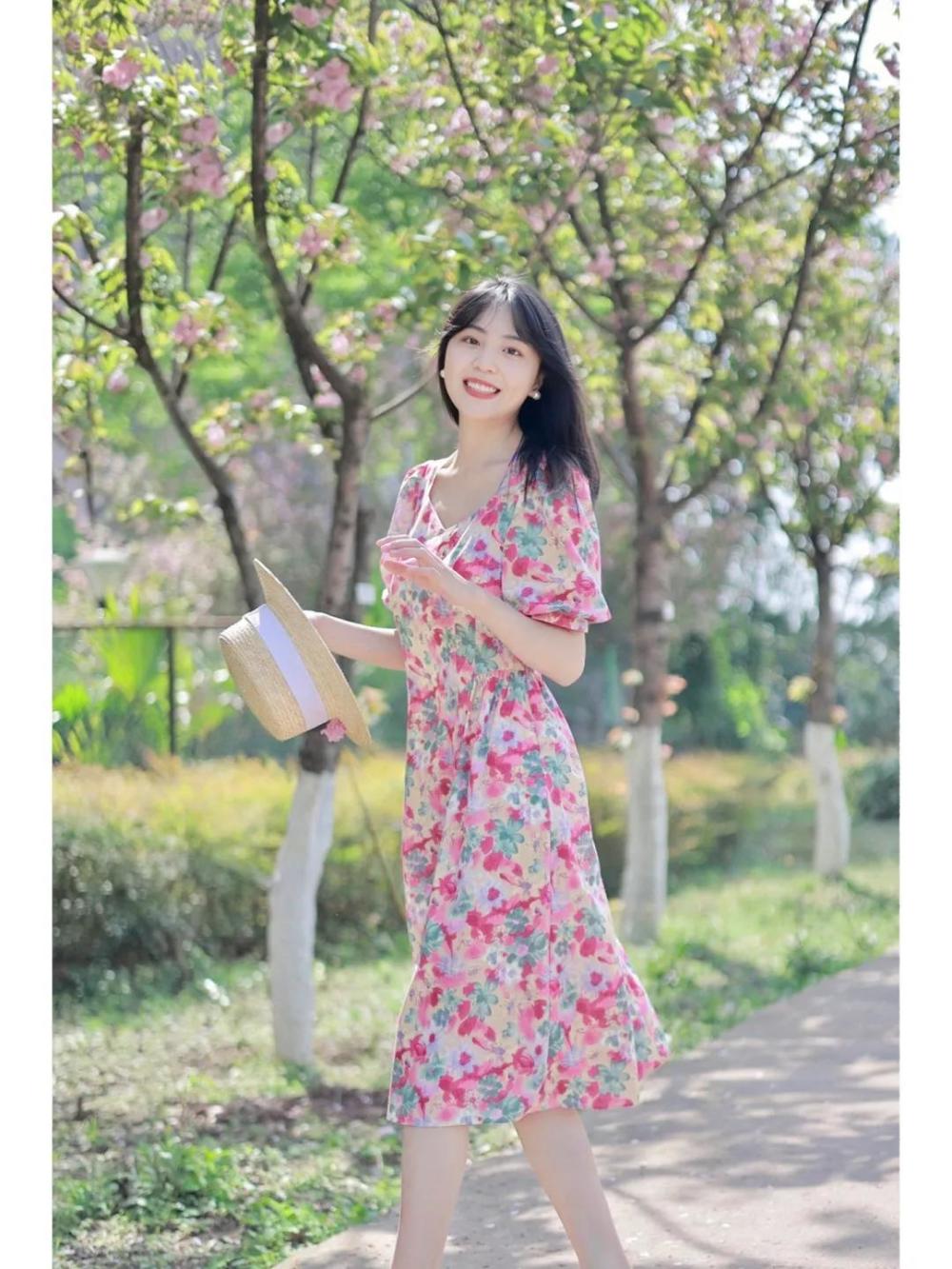 出门旅行,喜欢拍照的女生就很适合穿这一条印花的连衣裙,很符合现在的春天,再配上一款草帽,氛围感就出来了,拍出来的照片也特别的美,少女感十足。