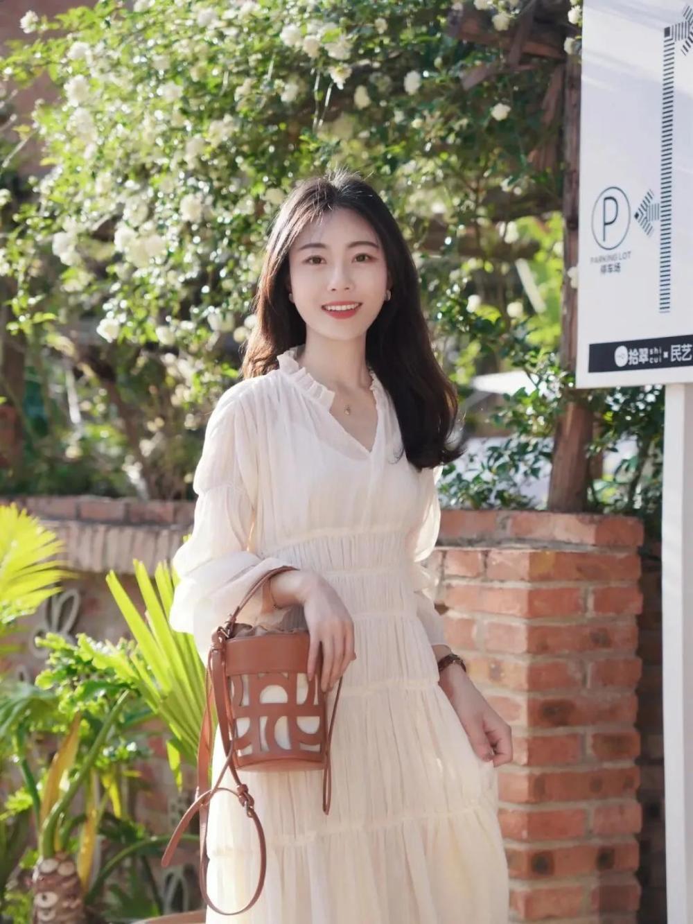 如果你是在南方城市的话,天气比较暖和了,你可以单穿里面的连衣裙,白色的连衣裙版型也非常好看,领子的位置做了一个木耳边的点缀,做了一个收腰压褶的裙摆,就算是单穿也特别地好看,a字的裙摆版型可以达到遮肉显瘦的效果,让你魅力全开。
