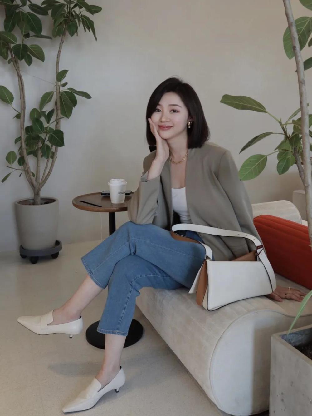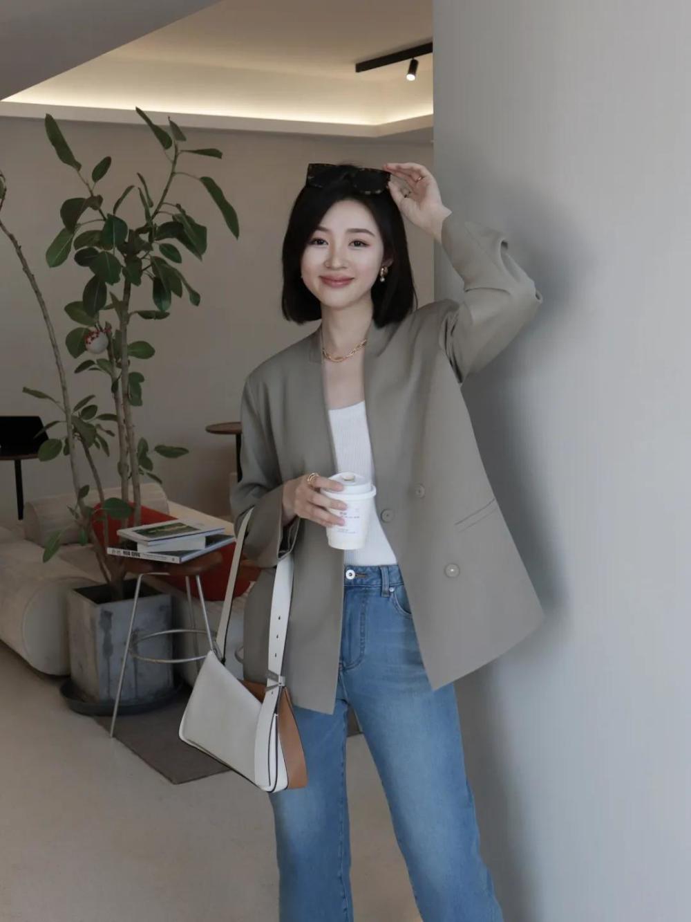 另外,在选择西服外套时,我们还可以从颜色上下功夫,尽量避开黑色的西服外套,因为黑色很容易穿出正式感来,我们可以像素人博主一样,选择棕色的或者是灰色的西服外套来搭白T恤,加上这条蓝色的牛仔裤,轻松地就能穿出时髦感,穿去上班出门逛街是个不错的选择。