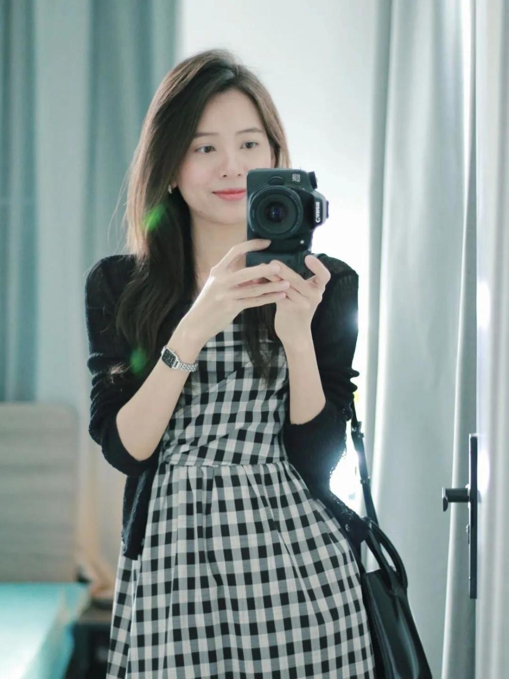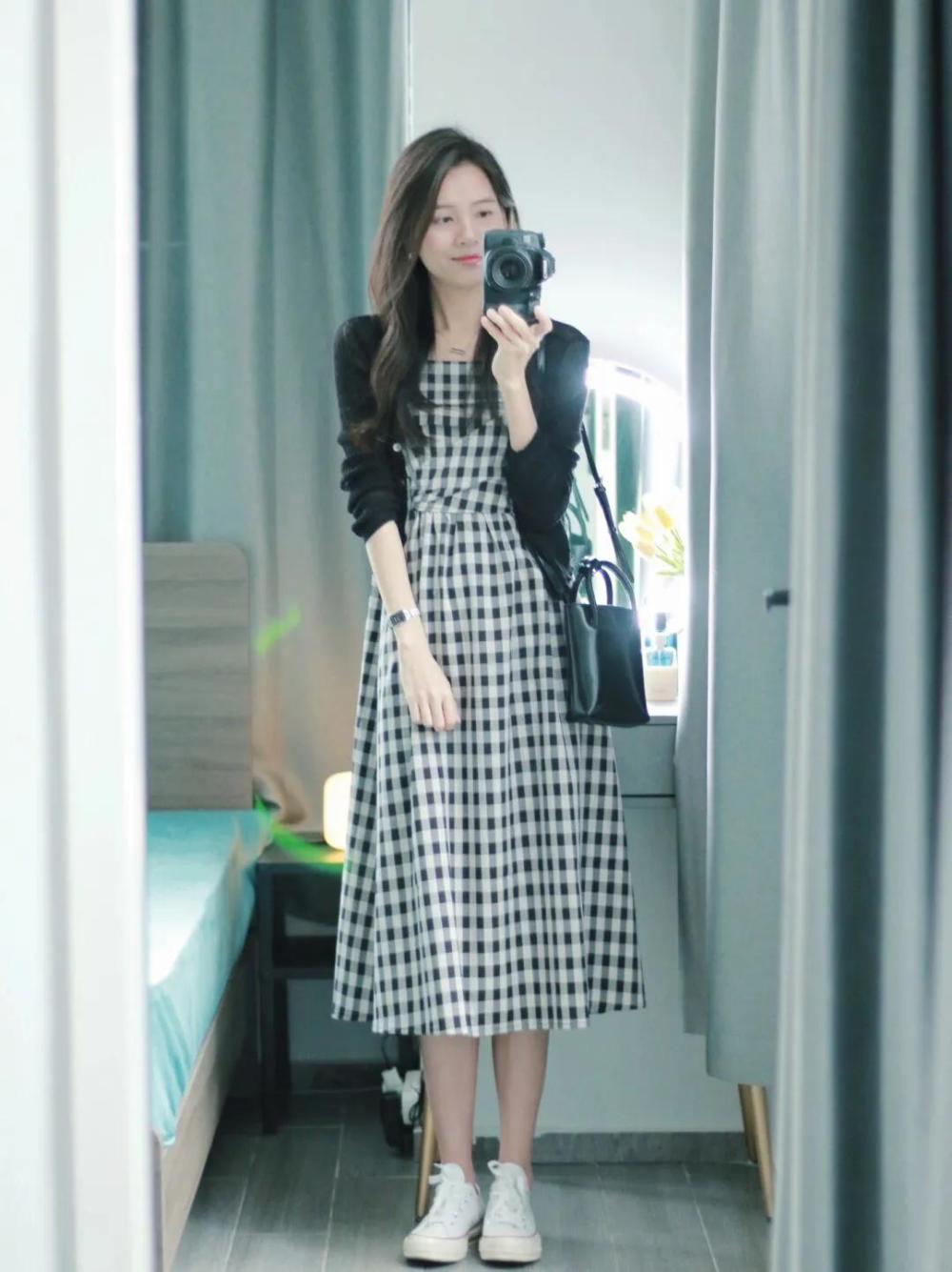 像下面这位博主,里面的连衣裙就是格纹的设计,添加了浪漫洋气的氛围感,同时也让整个造型的颜色显得更加有层次,上黑色的针织开衫外套,他能更好地削弱,里面格纹元素的连衣裙,让格纹元素不要过于跳脱的即视感,这样繁简的踏背方法很抢眼。