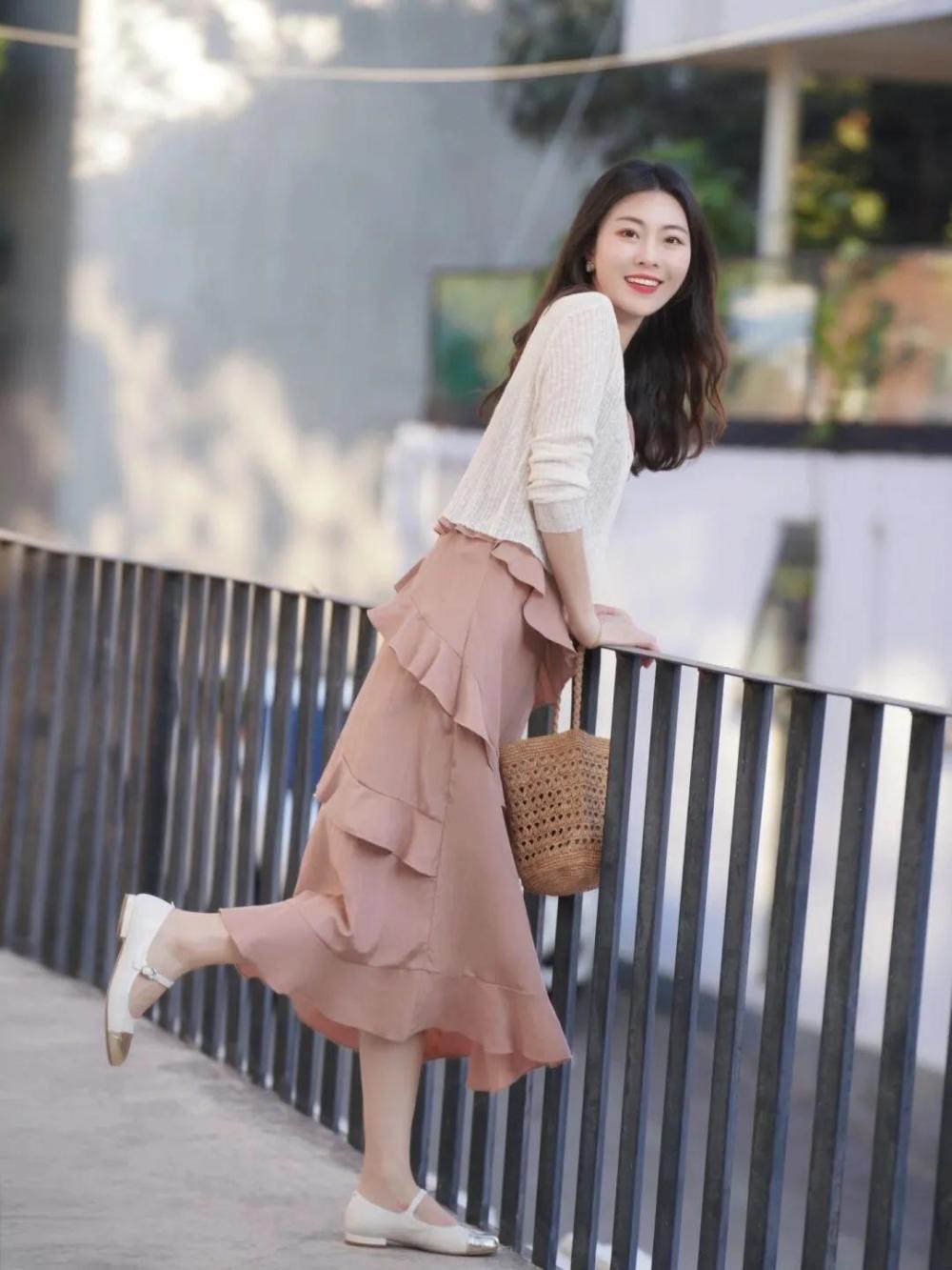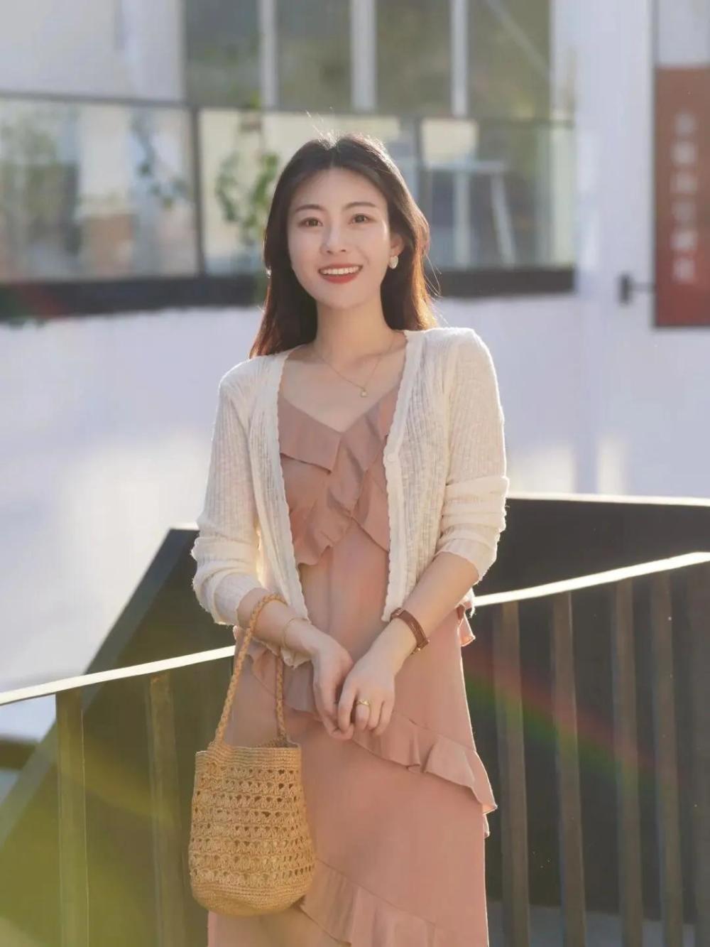 博主是用白色的针织开衫和粉色的连衣裙进行搭配,这样可以很好地形成一个撞色的效果,这样整个造型的衣服颜色搭配也不会那么地单调。