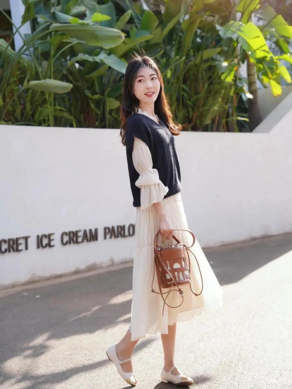 ④、黑色针织背心搭配上白色的连衣裙,俏皮又优雅