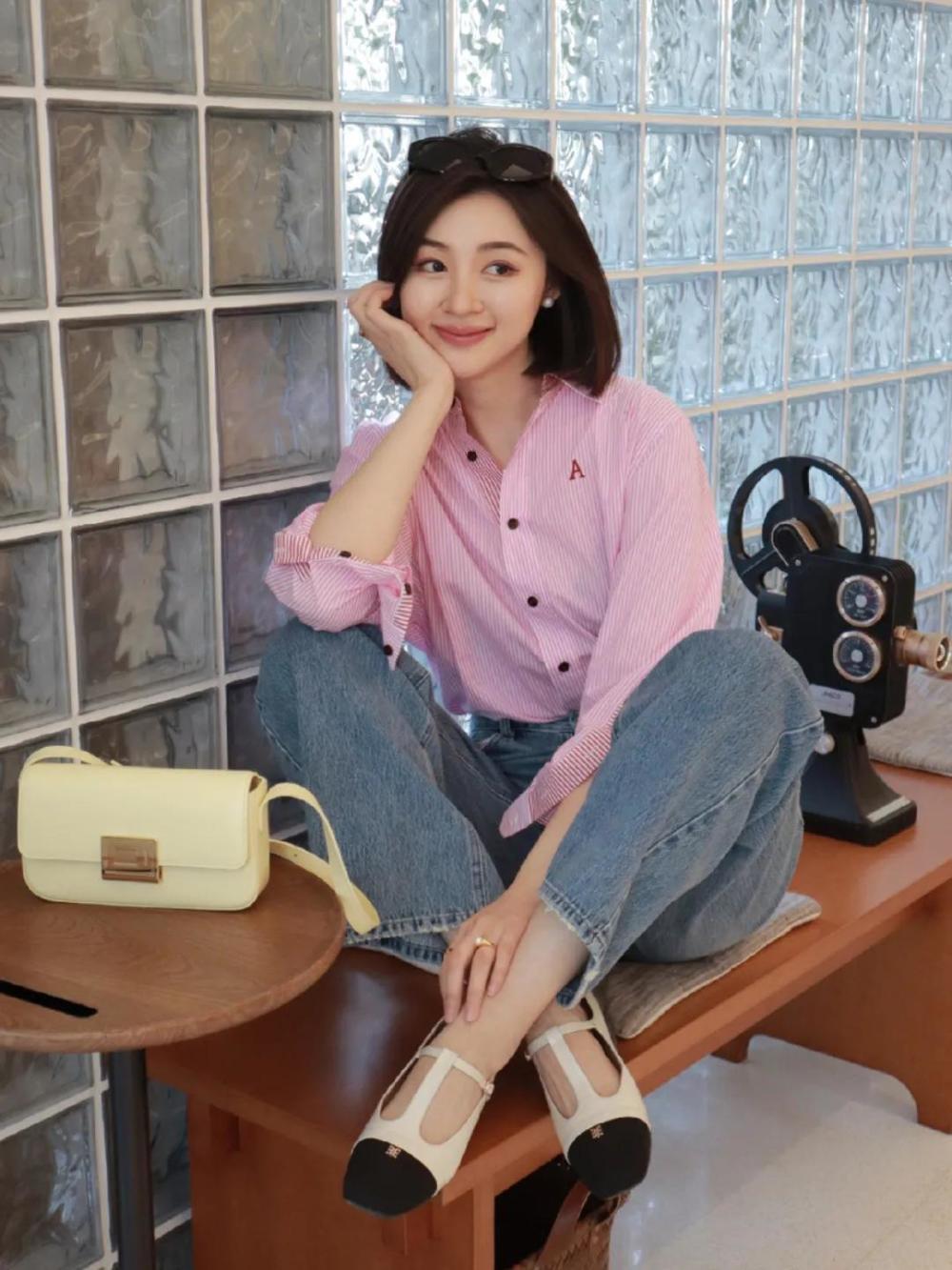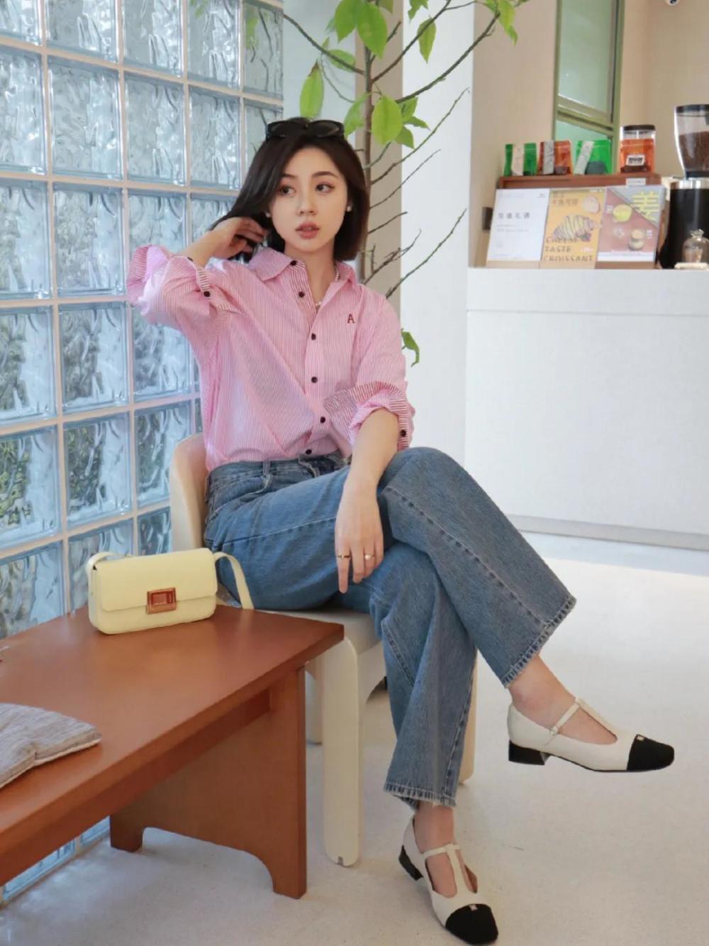 不管是身形纤瘦的女生,还是微胖的姑娘,都可以选择向这位素人博主一样的粉色衬衫搭配上蓝色的牛仔裤,因为衬衫大多数都是宽松版型的设计,可以达到遮肉显瘦的效果。