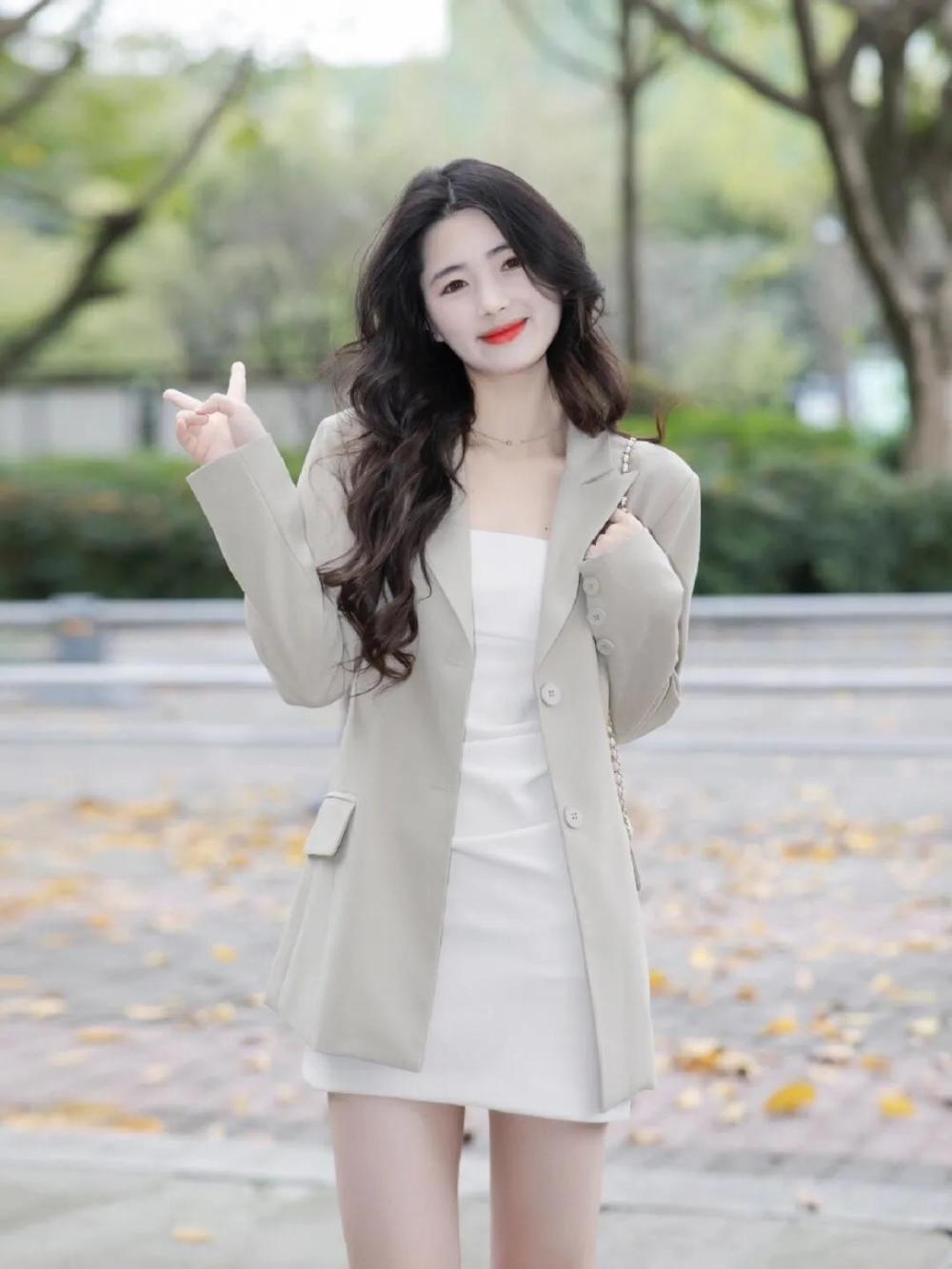 对于普通女生来说,在穿衣打扮的时候可以多选点纯色系列的衣服单品来搭配,这样可以降低你的衣服搭配颜色的出错率,让下面这一套用灰色的西服外套内搭一件白色的连衣裙,就能轻松穿出时髦感,简约干练,再结合上大波浪的卷发造型,看起来还很优雅。