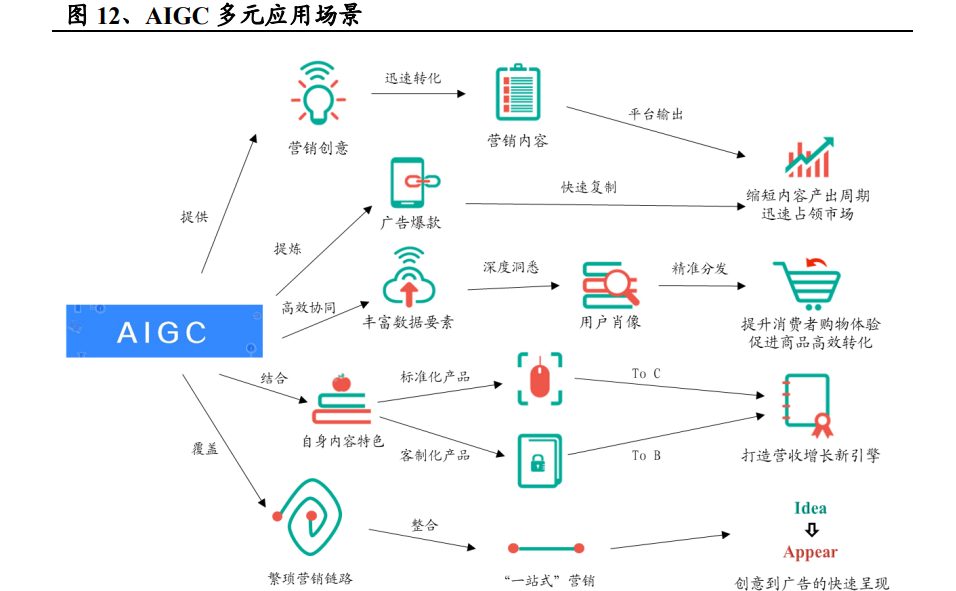 AIGC 开启精准营销的全面提效升级。在用户侧,AIGC 不仅通过大量数据要素积 累,还通过与用户的实时交流等方式,多渠道多类型数据融合构建更加多元精准 的用户画像;在内容侧,AIGC 依靠强大算力基础,通过用户标签迅速匹配相应图 片、视频要素,实现特色化内容定制;在反馈侧,通过对投放的效果数据 “再标 签化”,AIGC 可进一步进行投放调优,实现内容分发机制自动化提效。