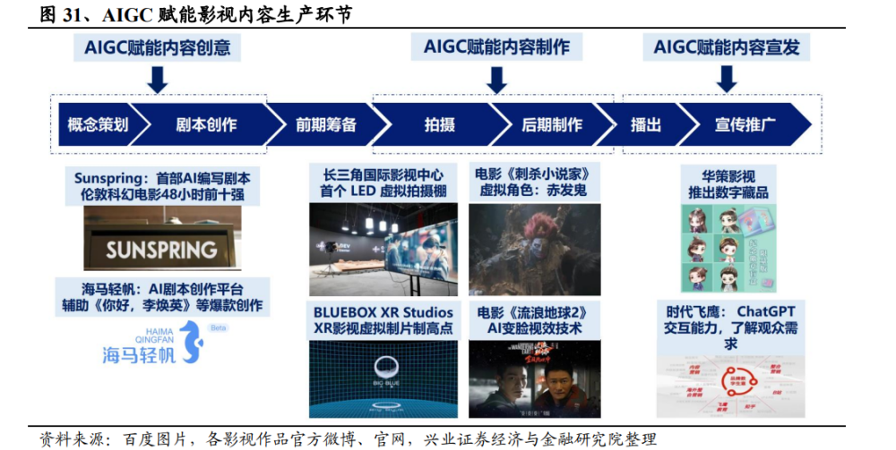 AIGC 提升生产效率,创作想象空间广阔。近年来,数字化战略对影视行业的赋 能作用显著,头部企业积极探索 AIGC、虚拟影棚等新技术的应用,提高制作效 率,同时提升平台持续产出优质内容的能力。未来,AIGC 有望赋能剧集制作的 更多环节,全面提升内容生产效率、增加内容呈现的丰富性与想象力。