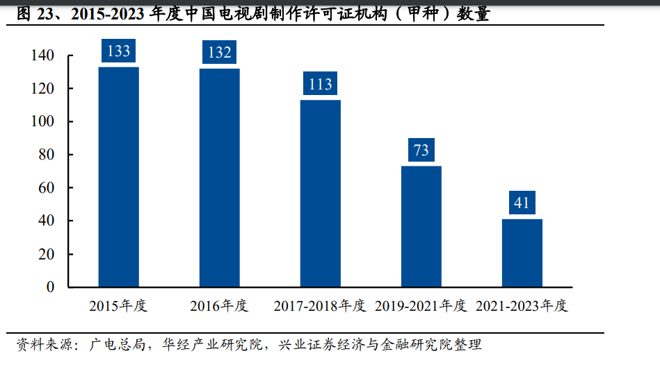 甲种制作机构减少,剧集行业供给侧加速出清。从事电视剧制作业务机构需要取 得《电视剧制作许可证》作为经营资质,其中“甲种”要求制作机构在两年内完成 6 部以上单本剧/3 部以上连续剧(每部 3 集以上)才可换发/申请。经历 2017 年以 来的严格监管、疫情冲击等不利因素的影响下,行业步入理性阶段,供给侧出清 明显。据国家广电总局披露,2021-2023 年持证机构仅 41 家,较 2019 年下滑 44%, 对比 2010-2016 年均在 130 家以上,剧集备案数量由 2018 年及以前的 1000 余部 缩减至 2021-2022 年的 500 部以下,发行总量由 300 余部降至 200 部以下。