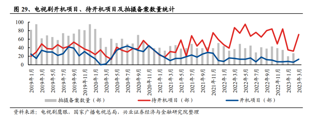 疫情期间剧集项目积压严重,全面放开后剧组产能明显恢复。疫情期间,受封控 等因素影响,影视剧组被迫推迟开工或项目停摆,大量已经拿到拍摄许可备案但 无法开机的项目积压,抑制了剧集公司的产能。2022 年末,国家卫健委发布《关 于进一步优化落实新冠肺炎疫情防控措施的通知》,共提出十条新措施,最大限度 减少疫情对群众生活秩序及经济社会发展的影响。随着疫情封控影响消除,剧组 复工复产推进,新开机项目部分将于 2023 年确认收入,2023 年拍摄但未上线的 项目亦有望带来后续年份供给端的持续提振,行业回暖可期。