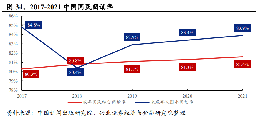 全民阅读深入推进。自 2014 年以来,“全民阅读”已连续十次被写入政府工作报告, 且提法已由“倡导”转变为“深入推进”,彰显了国家将持续发展“全民阅读”的决心。 此外,据中国新闻出版研究院数据,2017-2021 年中国成年国民综合阅读率已由 80.3%提升至 81.6%,未成年人图书阅读率也由 2018 年的 80.4%恢复至 2021 年的 83.9%。全民阅读的深入推进,将持续提振图书出版市场增长信心。