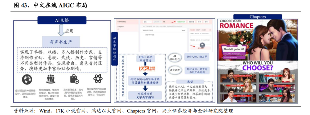 传媒+图文:AIGC 的技术突破将带来内容行业生产方式的革命,基于当前 大模型演进成果,以图文内容为供给主体的传媒公司有望迅速实现降本增 效,布局图文业务的中文在线、平治信息。 中文在线目前已上线 3 款 AIGC 相关产品,分别为 AI 主播、AI 绘画和 AI 文字辅助创作。AI 主播已在有声书生产中应用,根据文字故事情节的真实 语境,用独创的情绪情感控制模块,结合语音深度学习合成技术,真实还原 角色情感,生动模拟人声音色以塑造角色,讲述故事;AI 文字辅助创作功 能已在 17K 小说网上线,可自动生成文字内容,作者在使用该功能时,通 过针对不同的描写场景填写关键词和辅助短语,即可生成对应的文字内容描 写用于作品使用,目前可针对人物、物品等进行 AI 文字创作,并针对不同 的作品类别如古风、都市等进行语言调整,释放创作者更多的精力和重心放 在内容故事创作上,从而为平台及整个行业输出更具有价值的精品内容; AI 绘画已在海外产品 Chapters 中使用,通过文生图,产生的图片使用在互 动式视觉阅读中的,提升 Chapters 中作品的沉浸感和互动效果。