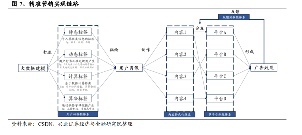精准营销成为企业买量趋势。精准营销建立在大数据基础上,围绕用户的属性、 行为、特征等描摹用户肖像,划分用户群体,并针对不同群体制定不同的营销策 略。用户标签化是精准分发的基础,通过收集用户不同维度方向的数据进行分析、 统计,挖掘和洞察有价值的信息;内容特色化是高效转化的保证,根据标签客制 化符合用户需求及调性的内容,提高用户购买体验,提升 CVR;反馈流程化是效 果提升的方式,通过对投放效果的事后数据进行复盘与打标,总结最佳投放方式 与节奏,形成投放策略迭代。