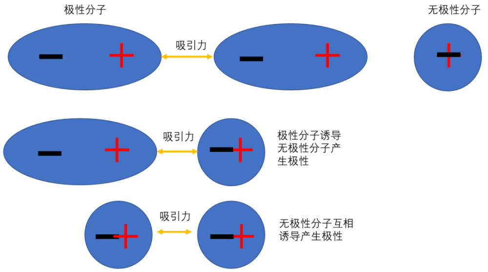 所以有极性的分子之间会因为极性的存在产生吸引相互作用。而无极性的分子在靠近极性分子或者互相靠近时,则由于原子之间的吸引力促使正负电荷中心发生偏移而感应出极性,从而产生分子间的吸引力。