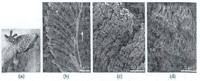 直到21世纪,由于微机电系统(MEMS)的发展,人们才确定壁虎脚掌上的粘附力产生过程为:壁虎按压脚掌使刚毛发生一定角度的弯曲,使绒毛贴在表面上产生范德华力从而形成粘附力。