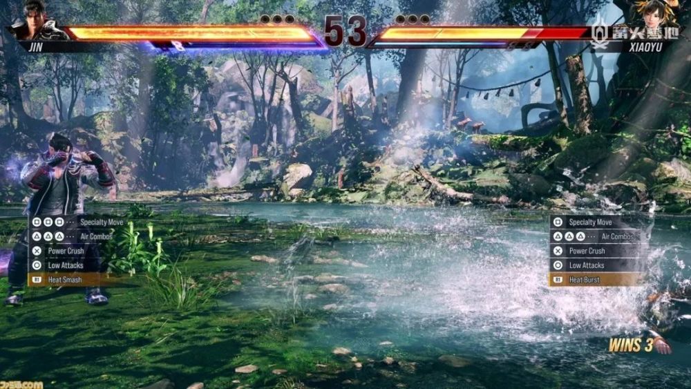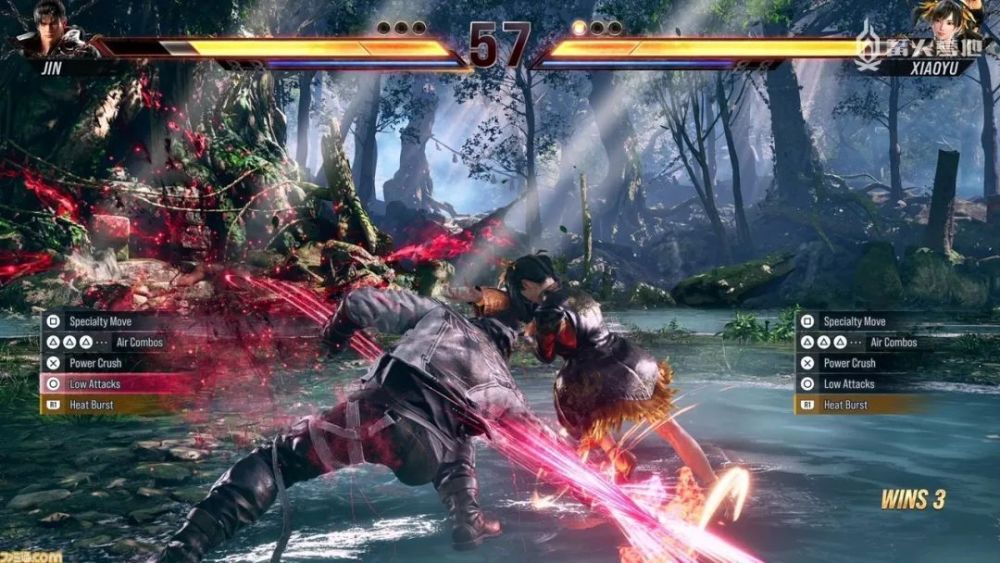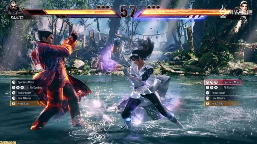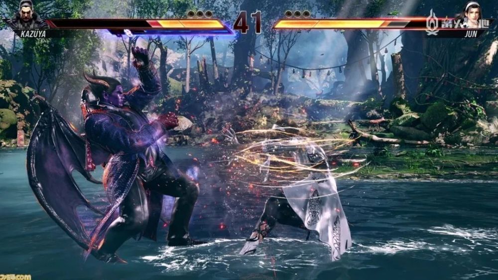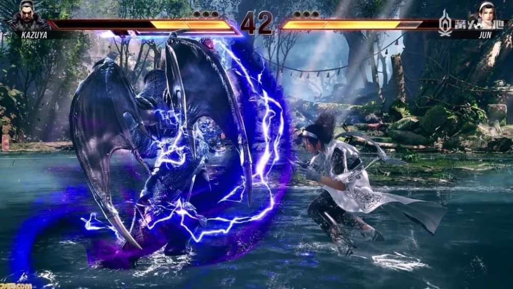 ▲仁被凌晓雨的连招击中之后的一幕。虽然空中连击的伤害本身与《铁拳 7》时期相比没有太大变化,但可回复的体力槽清晰地留了下来。针对可回复体力槽的竞博弈会是本作的一个重点凌晓雨命中对方的一幕,比较两张图凌晓雨的体力值,显然攻击命中后体力得到了一定的回复