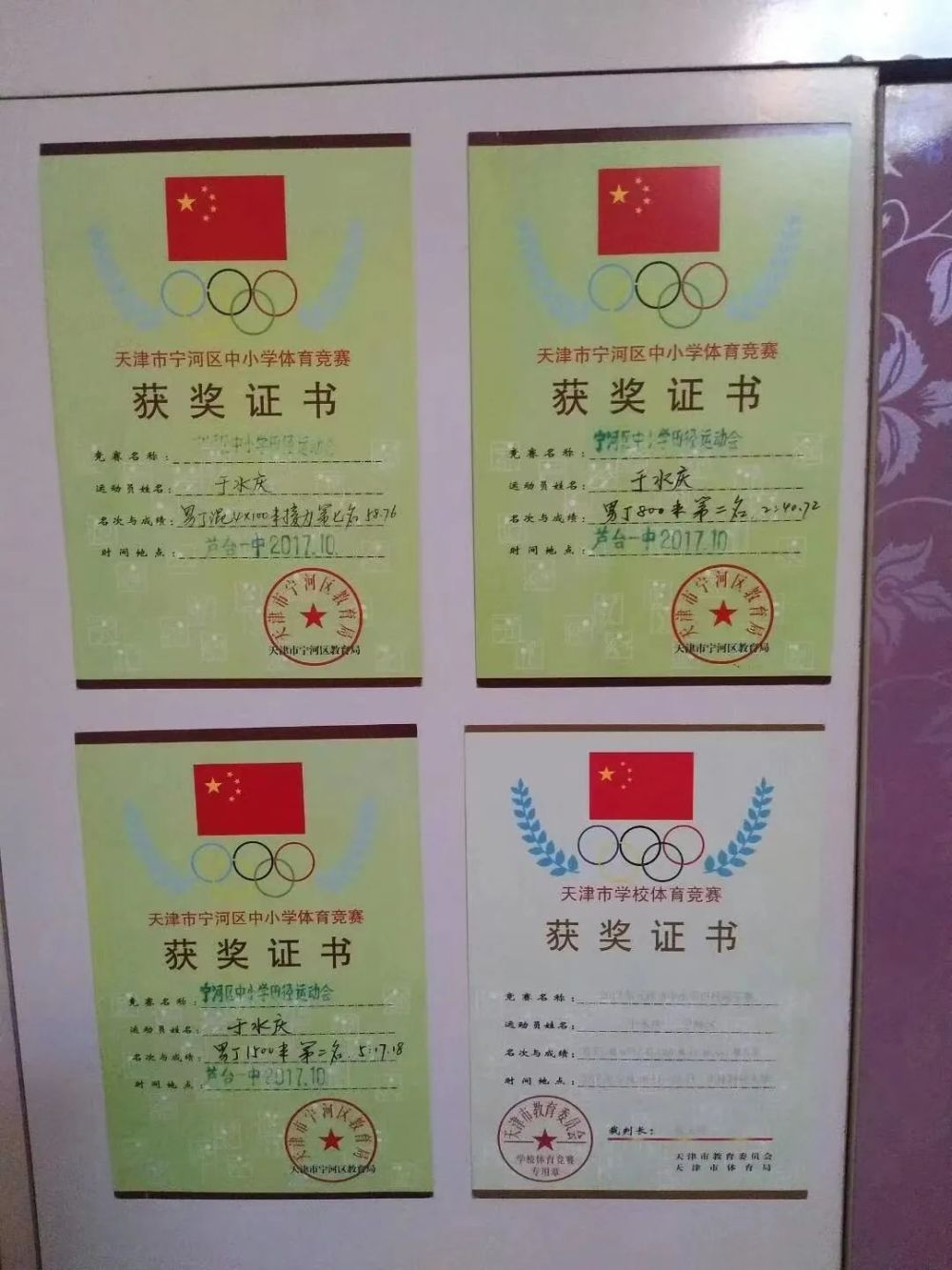 肉眼可见的运动天赋,很快被俵口小学体育老师李盼和庞春利发现,把他选进了校田径队进行长跑训练。在之后区里的800和1500米比赛中,基本都是前三名。参加天津市的比赛,也能拿到前几名。