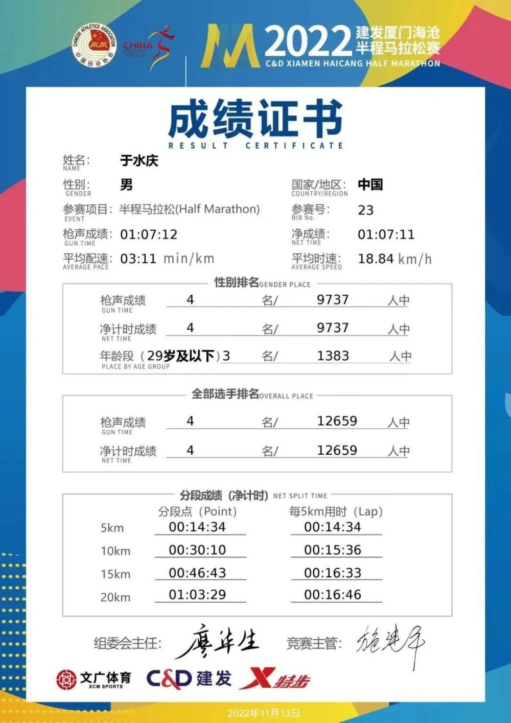 于水庆回忆这场比赛时说,“那一次,其实我感觉起步跑的特别快,对我还是有些挑战的,我也就没有多想,一直跟了上去,跑到第一个5公里是14分34,对于我当时的能力来说这个速度确实有点快,到了7公里左右我也就跟不住了。后面也跑的不咋好,成绩也不是很满意”。