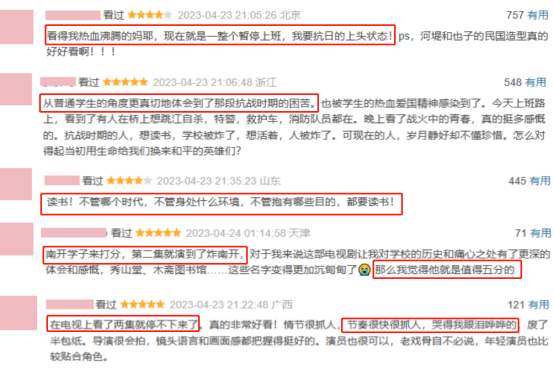 “看的热血沸腾”、“从学生角度体会到抗战时期的苦”、“值得五分”、“看了两集停不下来”等等。