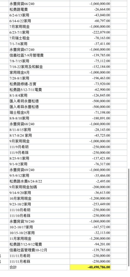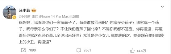 随后,大S妈妈回应汪小菲:“生活费、房贷本来协议离婚时是他付, 司机费是他付,但2个小孩从出生开始到现在,2个保姆加1个管家,3人每个月费用超过15万元都是熙媛付的。”而且透露汪小菲妈妈张兰发微信骂了她们全家半小时,“气到心跳快停止”。