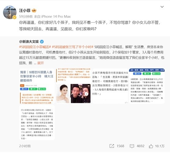 对此,汪小菲连发6文,称 “就骂你了,你把孩子还给我们怎么了?骂你没毛病。”并放话要检举小S。